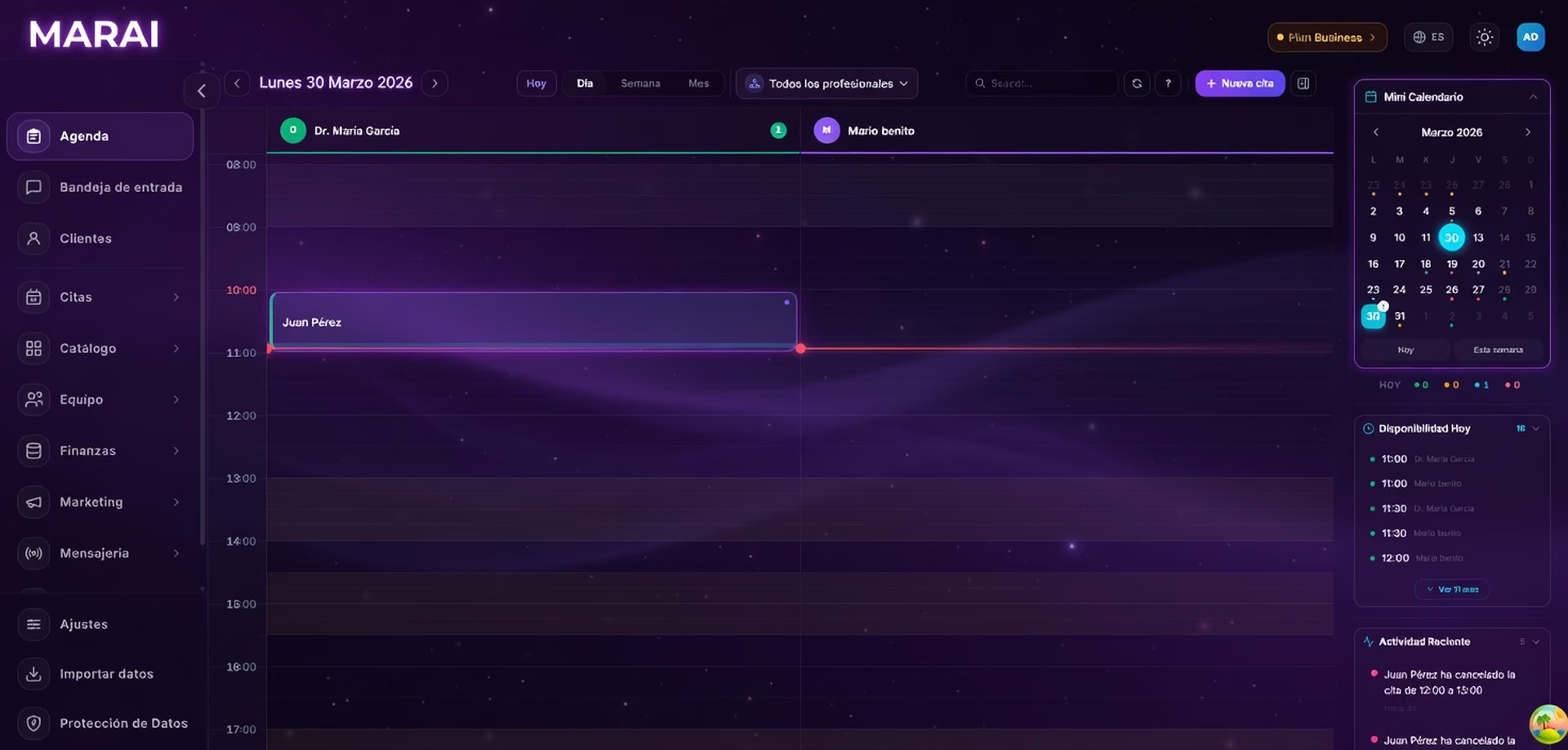 Marai es un software de gestión de citas con inteligencia artificial que automatiza reservas, cobros y recordatorios para negocios de servicios en España. Plan gratuito para siempre, sin tarjeta de crédito.